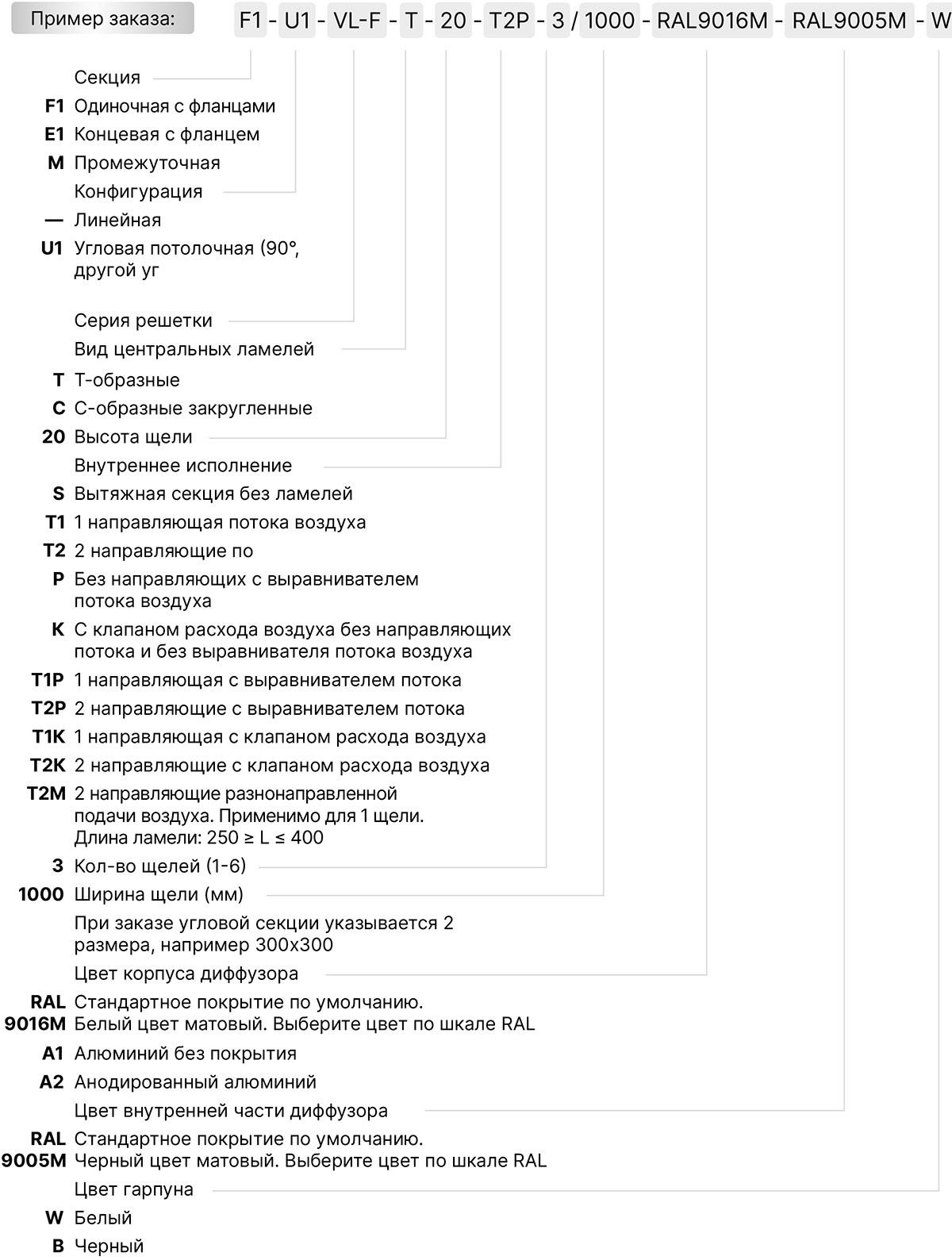 Щелевые решетки VL-F изготавливаются из экструдированного алюминиевого профиля АД31 по ГОСТ 22233-2018. По умолчанию корпус решетки окрашивается в стандартный белый цвет RAL 9016М матовый, а внутреннее исполнение в чёрный цвет RAL9005М матовый. По индивидуальному заказу возможна окраска в любой цвет по шкале RAL. Статическая камера изготавливается из оцинкованной листовой стали 0,4 - 1,5 мм в зависимости от размера и пожелания заказчика. По умолчанию все изделия поставляются в неокрашенном виде.