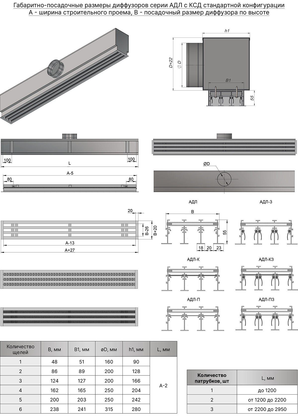 Щелевой диффузор АДЛ представляет собой вытяжную секцию без ламелей и без клапана расхода воздуха с высоким коэффициентом живого сечения. Относительно других моделей решеток этой серии, АДЛ имеет небольшой вес и более низкую стоимость. Могут быть самостоятельным изделием в виде одиночной секции или ее составной частью. После монтажа рамка решетки остается видимой, закрывая проем. Возможное количество щелей от 1 до 10.