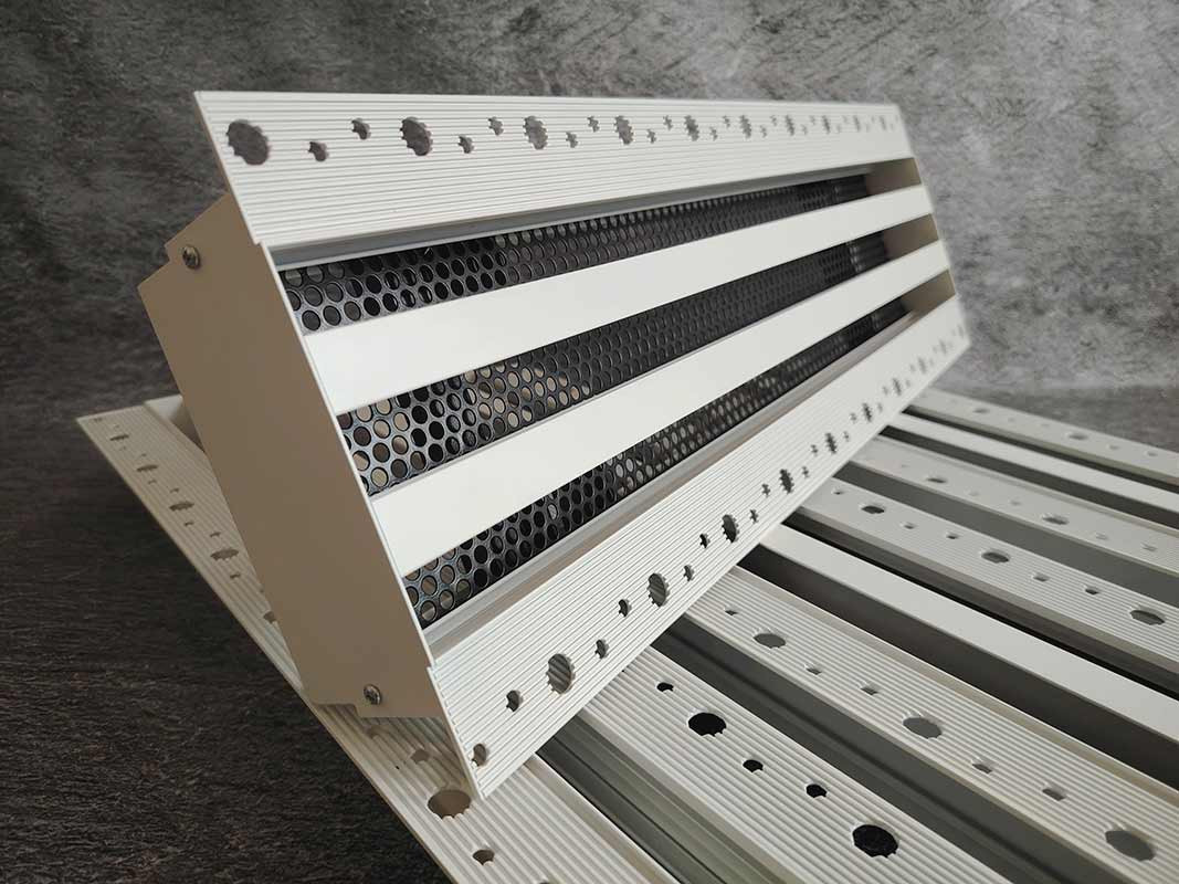 Конструкция профиля решетки предусматривает фланец с углублениями и отверстиями для лучшей адгезии финишного материала по длине решетки и заглушки с торца. После монтажа решетки, видимой частью в помещении остаются только щели.